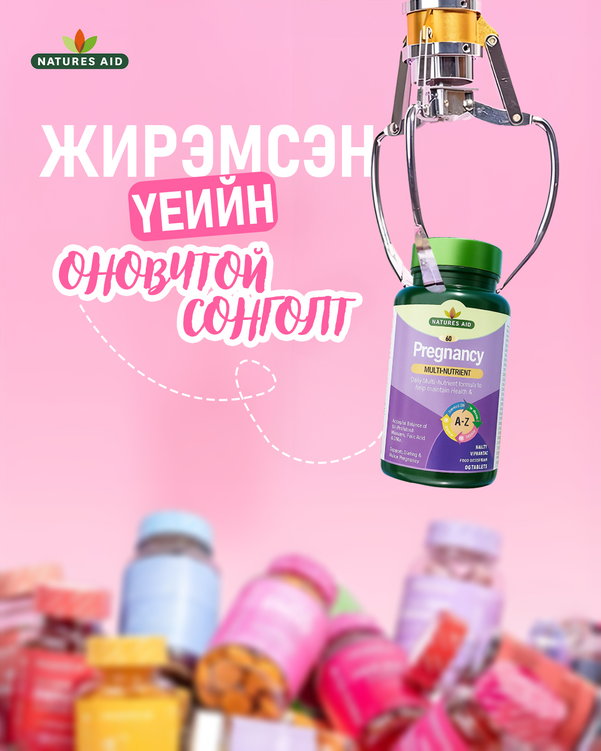 Харин Nature's Aid брэндийн "ПРЕГНАНСИ" бүтээгдэхүүн нь найрлагадаа Vitamin D3 Prep хэлбэрийн Д витамин агуулсан жирэмсний витамин юм.