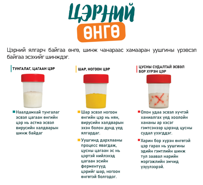 Өвчний үе болон хүндийн зэргээс хамаарч цэр нь өнгөгүйгээс эхлэн шар, ногоон заримдаа улаан өнгөтэй гарах нь ч бий.