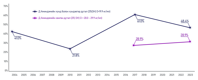 Тийм учраас удаа дараагийн хоол тэжээлийн судалгаагаар А, Д аминдэмийн үзүүлэлтүүдийг үзэж дутагдлын тархалтыг судалдаг. Энэ удаагийн үндэсний 6р судалгааны дүнгээр Монгол улсын 5 хүртэлх настай хүүхдүүдийн 7,1% нь А аминдэмийн дутагдалтай, 57,9% нь А аминдэмийн нөөц дутмаг байна. Харин 10 хүүхэд тутмын 5 нь Д аминдэмийн дутагдалтай, 31% нь Д аминдэмийн хөнгөн дутагдалтай байгааг илрүүлсэн байна.