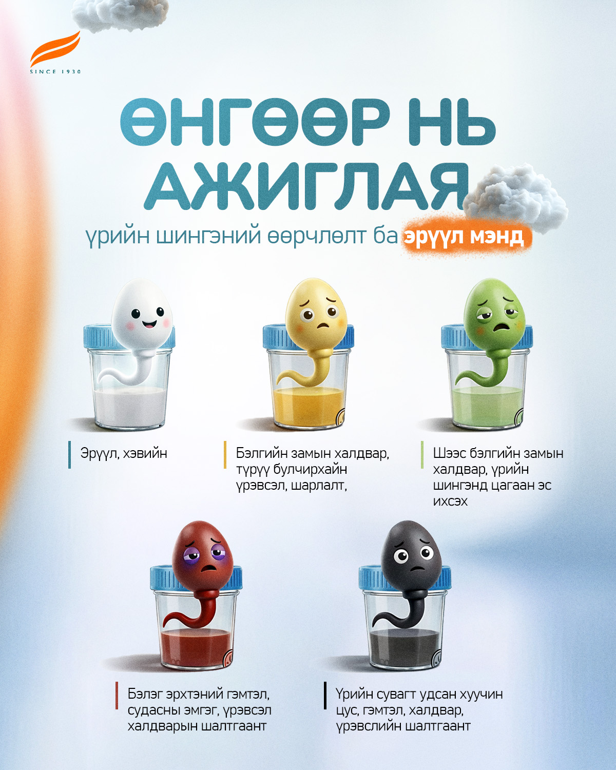 Үрийн шингэний өнгө, үнэр, өтгөрөл нь нөхөн үржихүйн тогтолцооны эрүүл мэндийн "ТОЛЬ" болдог. Ялангуяа эрчүүд ихэнхдээ ичих, санаа зовних, "өөрөө гайгүй болох байлгүй" гэж хойш тавьдаг тул өнгөний өөрчлөлтийг зөв ойлгож сурах нь эрүүл мэндээ эрт хамгаалах нэг арга юм.